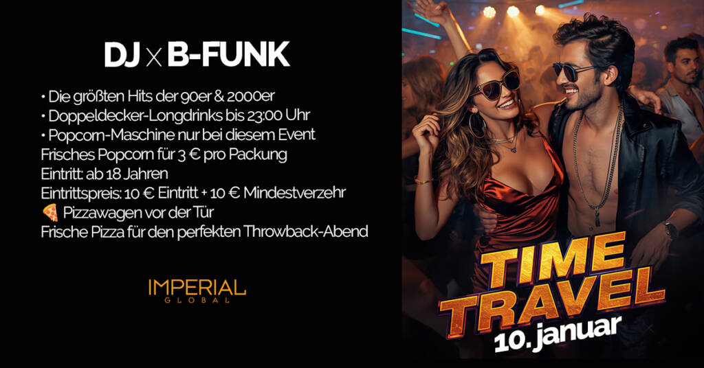 • Am 10,Januar verwandelt sich das Imperial in eine pulsierende Zeitmaschine. Unter dem Motto TIME TRAVEL nimmt DJ B-Funk die Gäste mit auf eine musikalische Reise durch die größten Hits der 90er & 2000er – von Dance- Classics über R’n’B bis hin zu unvergesslichen Party-Hymnen.