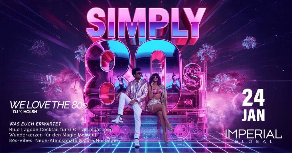 mit SIMPLY 80s bringt das Imperial Global den unverwechselbaren Sound und Lifestyle der 80er zurück auf den Dancefloor. Ein Abend voller Nostalgie, ikonischer Hits und echter Club-Magie in einer Stadt, die Feiern versteht.