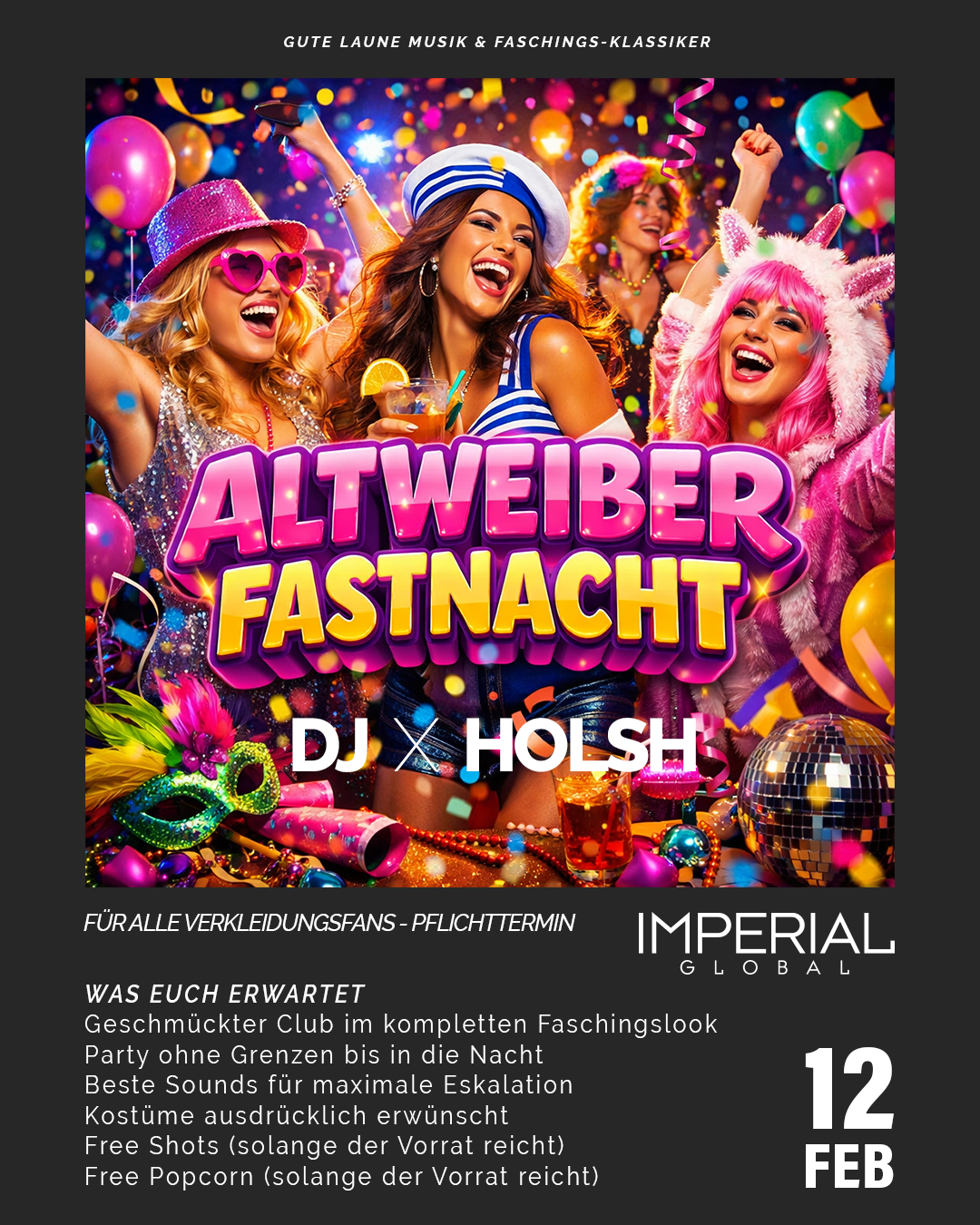 LADIES NIGHT – Girls just wanna have fun📅 Samstag, 21. Februar 2026 | 📍 Imperial Global | 🎧 DJ MATTODie Nacht gehört den Ladies.Glamour, gute Drinks und eine ausgelassene Stimmung.DJ…