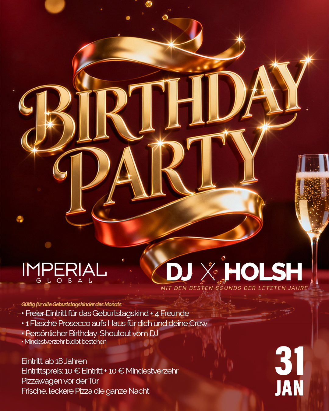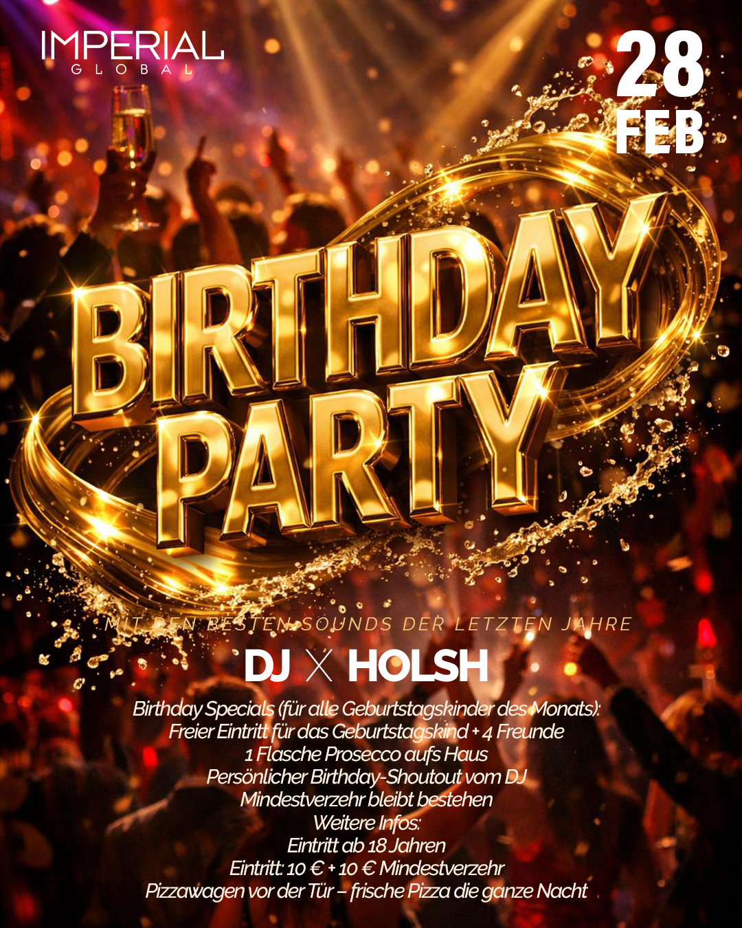BIRTHDAY PARTY – Alle Geburtstagskinder feiern gratis📅 Samstag, 28. Februar 2026 | 📍 Imperial Global | 🎧 DJ HOLSH Dein Monat. Deine Nacht. Deine Party.Bei der BIRTHDAY PARTY im Imperial…