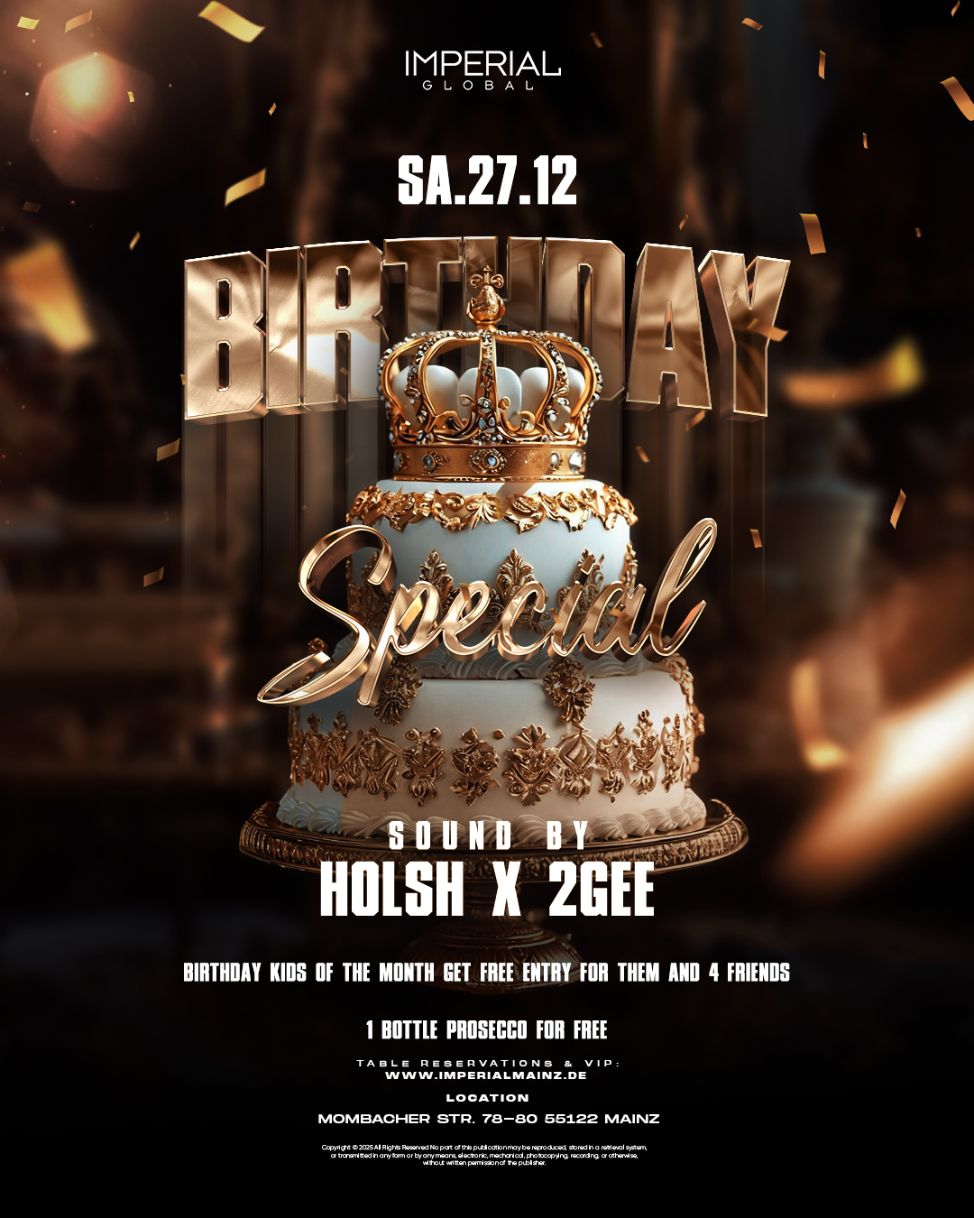 Birthday SpecialEventbeschreibungAm Samstag, den 27. Dezember, feiert das Imperial Mainz das exklusive Birthday Special. Die Veranstaltung richtet sich an alle Geburtstagskinder des Monats, die an diesem Abend gemeinsam mit ihren…