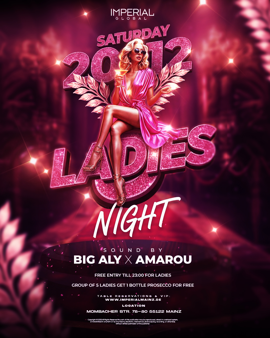 Ladies NightEventbeschreibungAm Samstag, den 20. Dezember, steht das Imperial Mainz ganz im Zeichen der Ladies Night. In glamouröser Atmosphäre feiern Gäste einen Abend voller Energie, Eleganz und guter Musik.Für die…